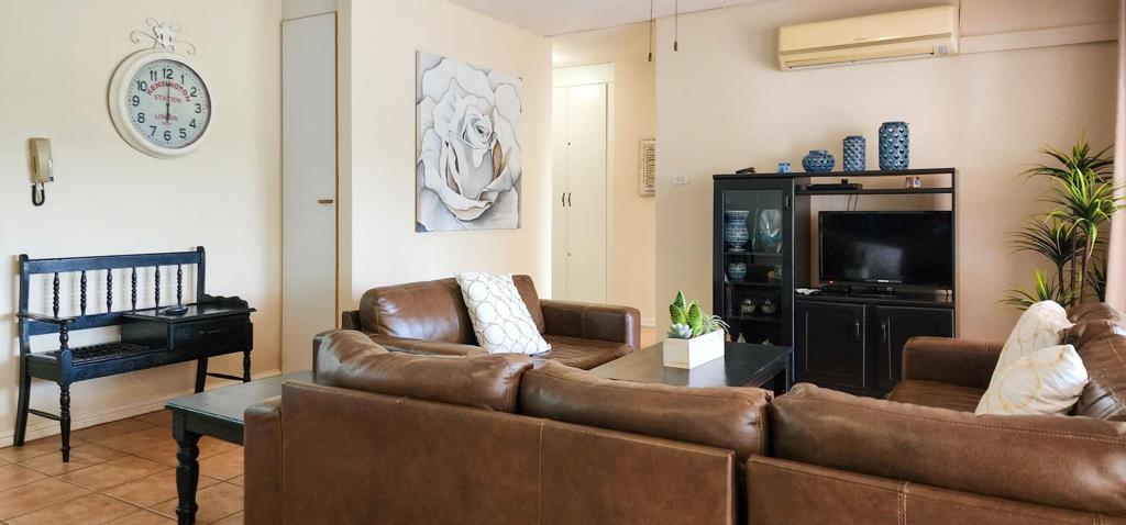 The apartment has an open plan layout that opens to an under-roof patio where you can relax and have a braai. The air-conditioned apartment (Lounge and two of the bedrooms) has three bedrooms, a living room, a fully equipped kitchen with granite countertops, a fridge and plumed appliances, and two bathrooms. The main bedroom opens to the patio and is en-suite.