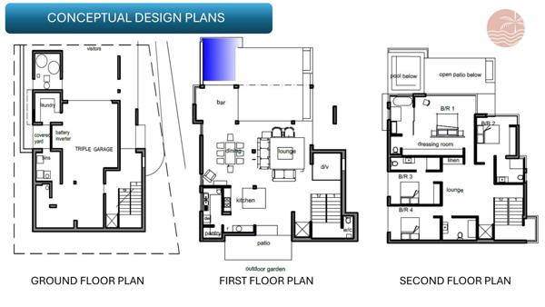 Each site is individually priced, and prices range from R3 885 000 to R3 995 000, with bulk allowances between 465565 sqm. The proposed three-level concept for the sites, which enjoy sea views, include featuring ground level triple garage, an open-plan living area on the first level that opens onto an outdoor elevated patio and three to four bedrooms on the uppermost level.