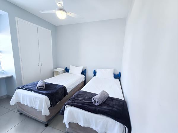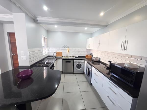 This well-appointed duplex in the secure coastal enclave of Shakas Rock offers relaxed living with the beach just steps away. On the ground floor, the open-plan kitchen, lounge, and dining areas lead out to a patio and braai area, where you can enjoy the fresh ocean air and beautiful views from the living spaces. A few steps take you directly to the golden sands of one of the North Coasts most loved beaches. This level also includes a guest toilet and single garage.