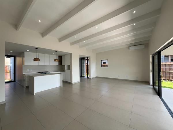 Both bedrooms are air-conditioned, with the main bedroom offering an ensuite bathroom. The pet-friendly garden is partially fenced and easy to maintain, making it an ideal lock-up-and-go option. A spacious double garage provides secure parking and direct access to the home. Located in a completed section of the development, both neighboring homes are already built and occupied, offering privacy and peace of mind. VAT is included in the price no transfer duty payable.