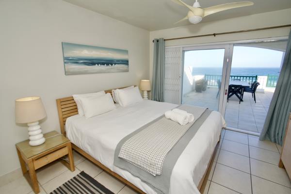 The main bedroom opens directly onto the sea-facing patio and features a modern ensuite bathroom.