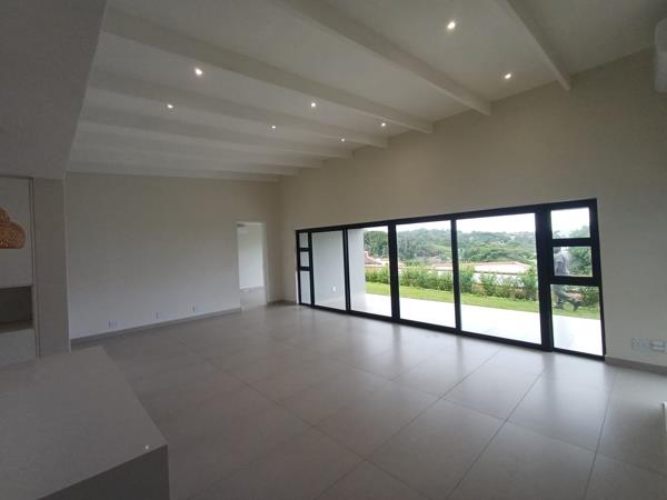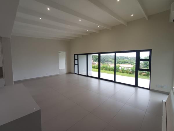 The open-plan living and dining area boasts a striking high-beamed ceiling, creating a sense of space and sophistication. Full-height glass sliding doors open seamlessly to the garden and covered patio, inviting the outdoors in and framing lush green views.