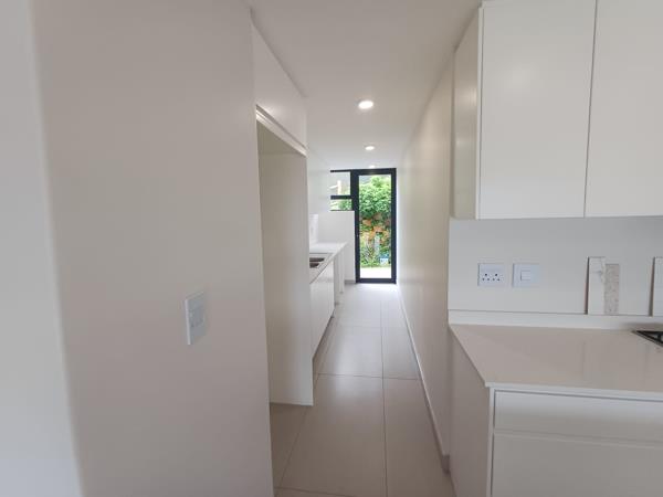 The sleek designer kitchen is a focal point of the home fitted with crisp white cabinetry, Caesarstone countertops, a central island, and quality gas appliances. A separate scullery provides ample storage and direct access to the back garden for convenience.