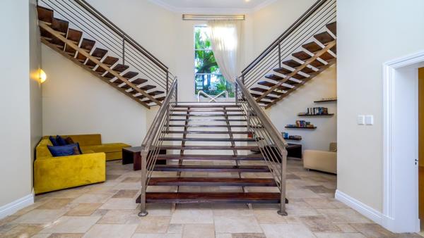 Staff accommodation includes two bedrooms, a kitchenette, and a bathroom, ensuring comfort and convenience for live-in help. The double-volume garage complements the homes soaring ceilings, while thoughtful features like sunken lighting, trellidoors, and a sparkling splash pool complete the picture.