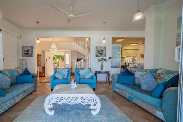 Well loved Mediterranean family home, built to owners specification with a paradisaic ambiance. This home offers well sized living areas with formal and casual living, covered patio stretching the length of the front of the house over looking the garden, swimming pool and magnificent sea views. Four bedrooms (all with BICS and main bedroom offering dressing room) and study. Country style open plan fitted kitchen with granite counters, gas hob & oven and scullery.
