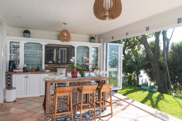 The centerpiece of the main home is the expansive glass-enclosed patio, which stretches across the width of the house. Featuring a built-in bar and multiple seating areas, this space captures stunning horizon ocean views while seamlessly blending indoor and outdoor living. Step outside to find a sparkling pool, a covered patio with a Jacuzzi, and a built-in braai, all surrounded by breathtaking coastal scenery.