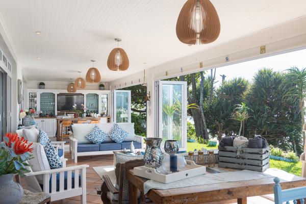 The ground floor includes a large kitchen with ample storage, a breakfast counter, and a scullery, which connects to the bright and airy dining roomalso offering beautiful sea views. The ocean-facing lounge flows effortlessly onto the glass-enclosed patio and the outdoor braai area, creating a perfect setting for entertaining or relaxing. Access to the beach is a breeze via two sets of stairs that wind through landscaped gardens to a private beach access gate. A charming sundowner deck is conveniently located along the path, providing the perfect spot to soak in the view.