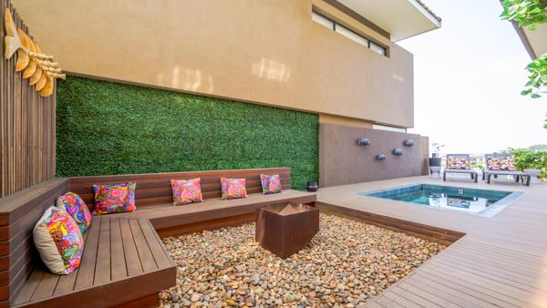 Sparkling pool with a bespoke fire-pit seating area, the perfect setting for sunset gatherings.