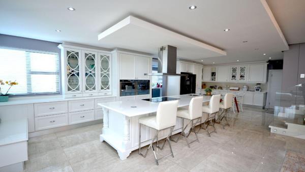 The modern open plan kitchen will entice you to become a Master-chef. Offering a large glass top stove and a freestanding gas Smeg stove, ELO and built in Micro. A large Cesar stone breakfast bar with all the bells and whistles. Scullery plumbed for the appliances. Plus a walk in fridge.