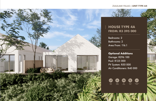 Located within a secure, private estate environment, each home is a stand alone unit with its own private garden and covered patio. The architectural design of Zululami Villas exhibits a meticulously planned and astute house typology.