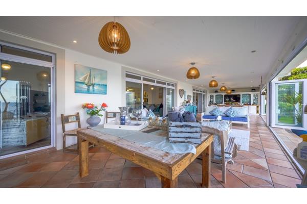 The open-plan downstairs living space features a fully fitted kitchen, dining room, lounge, TV lounge, and a convenient powder room. Across the width of the house, a covered veranda with stackable glass doors opens to a lush garden. This incredible entertaining area includes a bar, lounge, and ample seating to enjoy the uninterrupted ocean views.