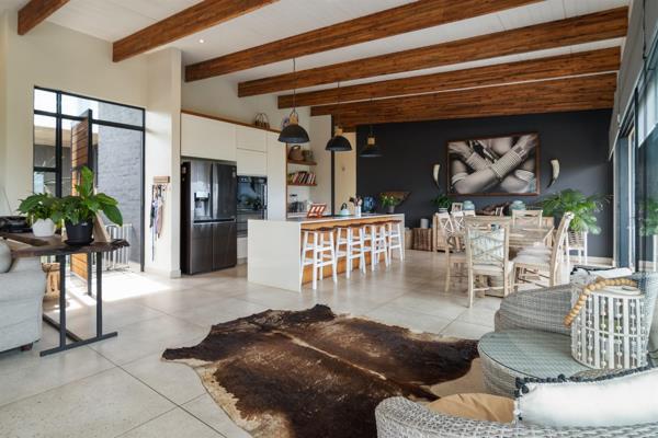 The elegant white kitchen is a striking focal point creating a vibrant cooking/eating/ social hub whilst the lounge area flows out onto the large, covered verandah complete with serving counters, a gas braai, and an alfresco dining space. This outdoor haven is perfectly suited to relaxed entertaining against a breathtaking backdrop.