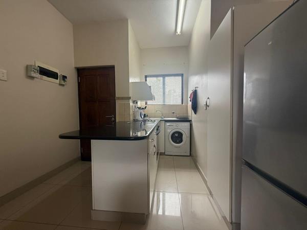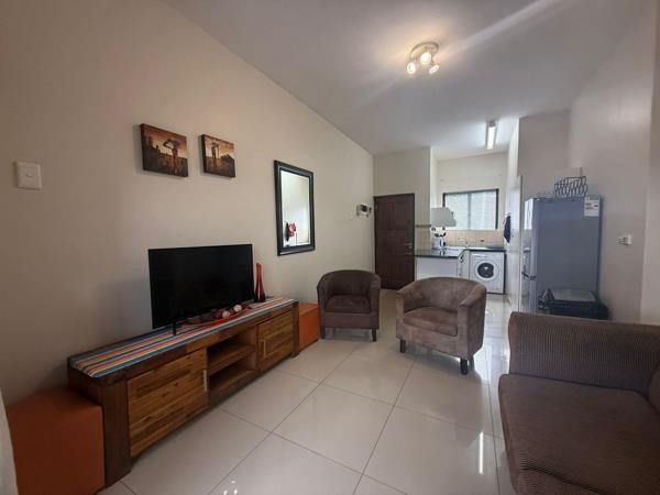 The open-plan layout flows seamlessly between the kitchen, lounge, and dining area, creating a welcoming and versatile living space. The modern kitchen is fitted with granite countertops, a hob, and an ovenideal for everyday cooking and entertaining. The lounge opens through double sliding doors, also fitted with mosquito screens, onto a private covered balcony. Surrounded by lush greenery, this tranquil outdoor retreat is the perfect spot for morning coffee or evening relaxation.