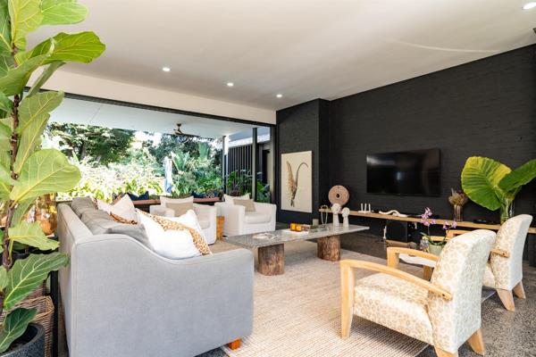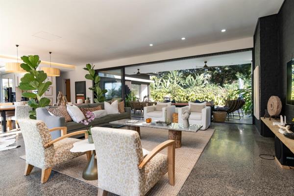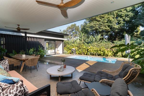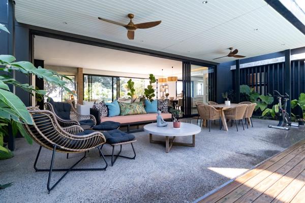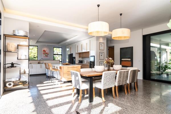 The open-plan kitchen, dining, and lounge areas extend seamlessly onto two outdoor spacesone with elevated views perfect for sundowners, the other a sheltered patio overlooking the pool and private garden.
