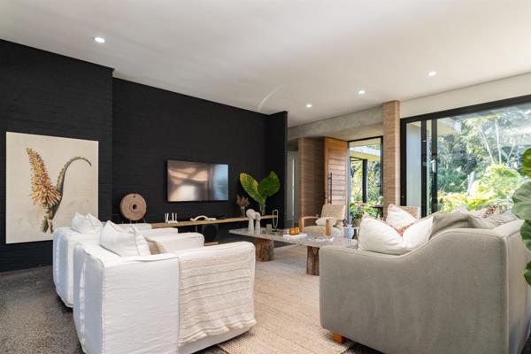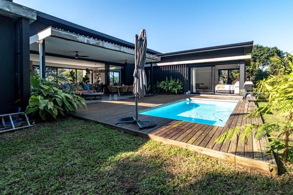This beautifully designed and curated four bedroomed modern home, located in the tranquil Elaleni Coastal Forest Estate, offers sophisticated indoor-outdoor living and also benefits from distant sea views.