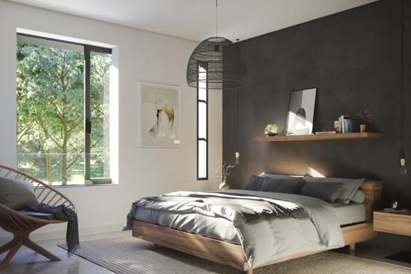 This modern three-bedroom townhouse is located in the second phase of The Woods, Elaleni and is currently under construction. The ground floor offers an open-plan kitchen, dining, and living area that opens onto a covered patio and private garden. The kitchen is fitted with a gas hob, and the unit includes a single garage. All three bedrooms are located upstairs, with the main bedroom en-suite and a shared second bathroom.