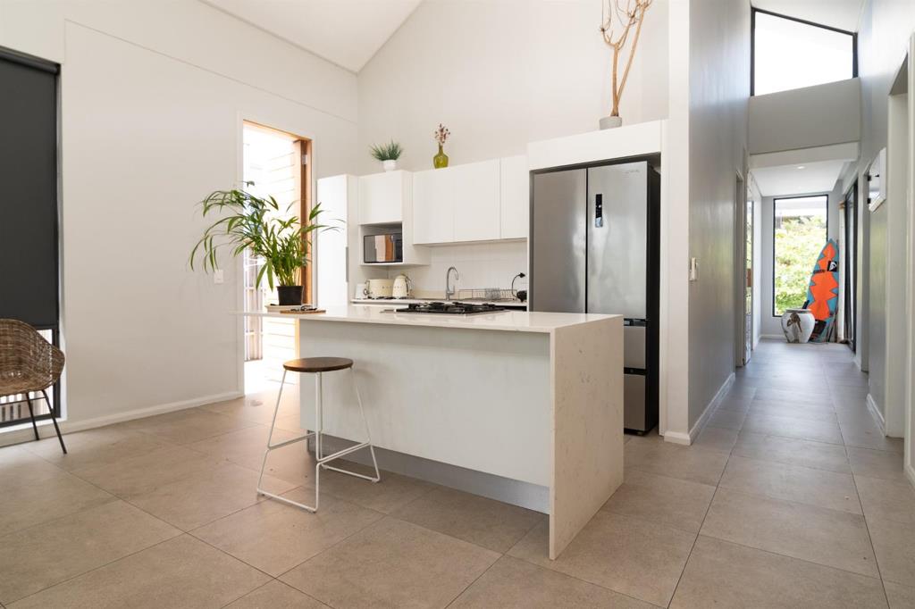 The spacious living area is framed by expansive glazing and a signature clerestorey window that welcomes in natural light, leafy views, and refreshing breezes. The open-plan layout connects the kitchen, dining, and living spaces onto an expansive outdoor covered balcony - ideal for entertaining or simply unwinding in a tranquil, forest setting. The high ceilings also augment its airy appeal whilst the modern island kitchen provides an inviting hub.