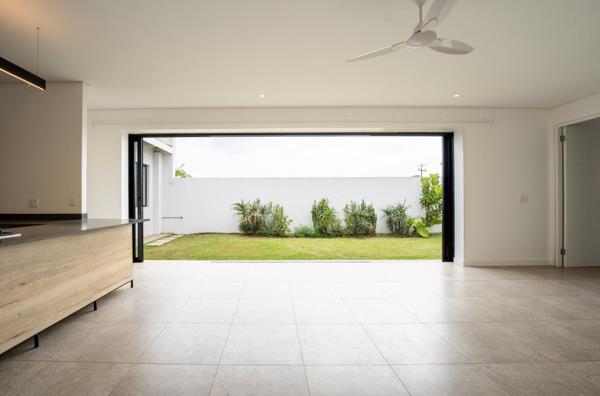 This level home in Elaleni Gardens comprises of three bedrooms and two bathrooms, with the main en-suite. There is an open plan kitchen, dining and living area that opens out onto the patio and garden.