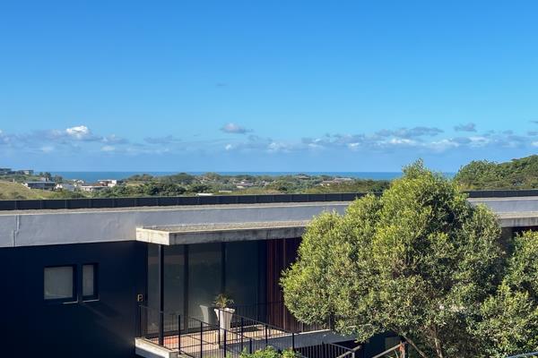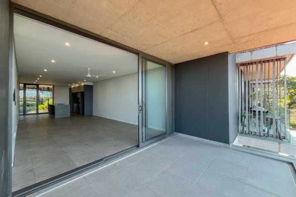 Modern two-bedroom apartment in Forest View, Elaleni Coastal Forest Estate. No Transfer Duty. On entrance the sleek kitchen features a center island, SMEG gas stove, and electric oven, seamlessly flowing into the open-plan dining and lounge area that opens to a covered patio with a frameless glass balustrade. Both bedrooms are ensuite, air-conditioned, and one offers direct access to the balcony. Fibre internet is already installed.