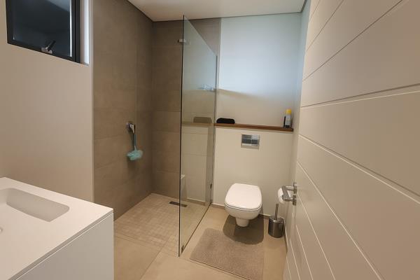 A stylish bathroom with a walk-in shower and contemporary finishes completes the home, offering comfort and elegance in every detail.