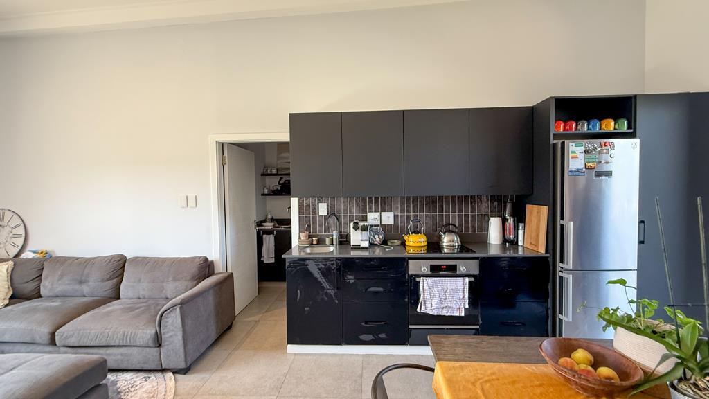 The spacious open-plan living area seamlessly flows onto a covered balcony, capturing picturesque views of the serene dam, natural wetlands, and lush coastal forest. The gourmet kitchen features upmarket, integrated appliances with a concealed scullery and laundry area, designed for both beauty and functionality.