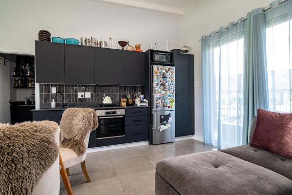 The open plan living area that holds a striking dark coloured kitchen and its linear layout easily accommodates a dining area. A large glass sliding door connects the interior space with the outdoor balcony that offers far-reaching views, creating a seamless transition between indoor comfort and outdoor serenity.