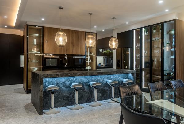At the heart of the home lies a state-of-the-art kitchen, showcasing a double-stove cooking area, fully integrated appliances including a coffee machine, microwave, and oven, and stylish glass display shelves accentuated by soft LED lighting. The hidden scullery ensures the elegance of the main space remains uninterrupted. A unique bellhop lift from the kitchen to the main suite upstairs adds an unexpected and luxurious touch, marrying convenience with contemporary flair.