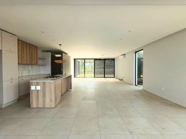 This modern townhouse combines luxury with secure estate living on the North Coast. Expansive stacking doors connect the open-plan kitchen, scullery, and living area to a large balcony with sea and estate views, as well as a private garden.