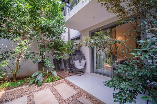 The apartment welcomes you with an elegant open plan living and dining area that flows effortlessly onto a covered patio, ideal for relaxed entertaining or quiet evenings surrounded by lush greenery. The gourmet kitchen is a true highlight, featuring a sleek centre island, quartz countertops, hidden coffee station, and a five-burner SMEG gas stove a chefs dream complemented by practical yard access.