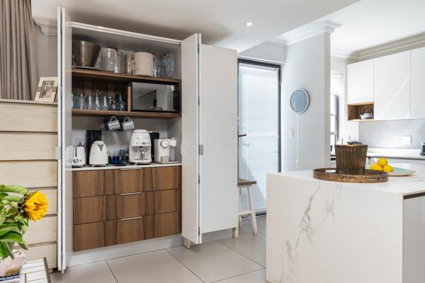 The sleek kitchen is a statement in modern artistry, with chic white cabinetry and a large central island counter with a beautiful waterfall countertop. It also includes a coffee and cocktail station elevating it even further than just a culinary space. The kitchen also leads out into a practical enclosed wash line area.