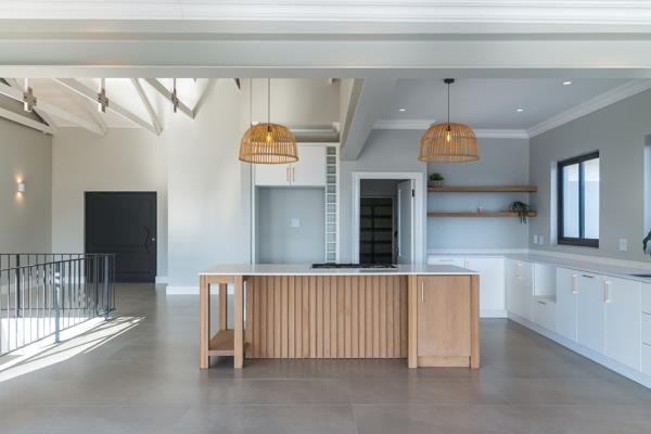 A separate scullery with floating wooden shelves, ample storage, and a private utility courtyard is accessible directly from the double garage, adding everyday convenience.