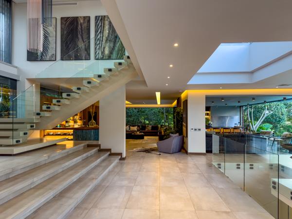 It offers four spacious ensuite bedrooms, two located on the top floor and two on the lower garden level, each designed with tranquillity, privacy, and outdoor connection in mind. The master suite opens onto a private balcony and includes a sophisticated, spa-style bathroom that exudes indulgence and serenity. The second upstairs bedroom also enjoys balcony access and a full designer bathroom. A private TV lounge on the upper level provides an exclusive space for relaxation and serves both top-floor bedrooms, with direct access to an elevated outdoor patio that captures sweeping estate views. The central, walk-in level forms the heart of the home. Here, expansive open-plan living spaces seamlessly integrate multiple indoor and outdoor areas. At the centre, a striking custom-designed bar creates a bold focal point, surrounded by dual lounges and versatile seating areas. Two covered patios extend the living space outdoors, featuring a pizza oven, gas and wood/coal braais, and a stylish dining area, ideal for all-season entertaining.