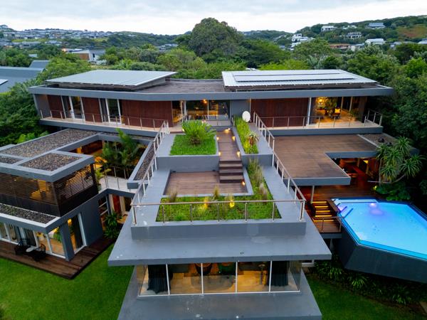 Positioned at the end of a quiet cul-de-sac, with panoramic views over golf course greens, a tranquil dam, and a rooftop garden overlooking the 17th green and 18th fairway, this exceptional three-level home exemplifies refined living in the prestigious Simbithi Eco Estate. Thoughtfully designed for both luxurious comfort and effortless entertaining, the home features a highly refined floor plan that maximises light, flow, and functionality.