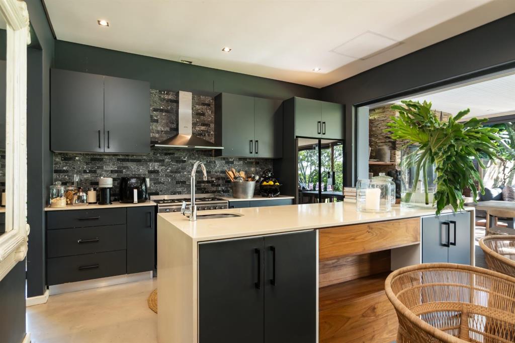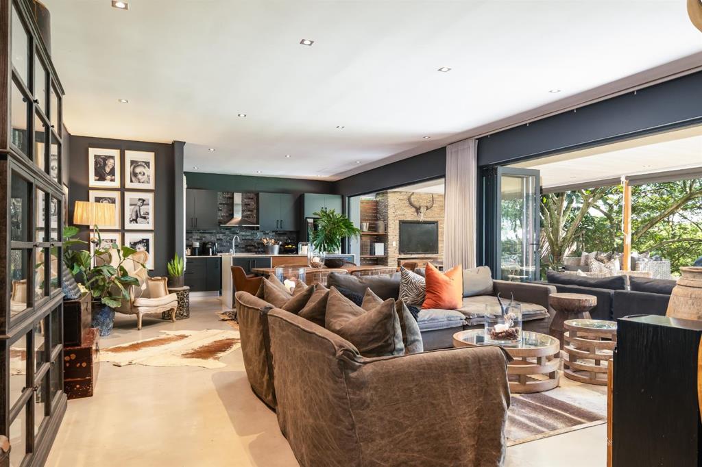 The entrance hall flows into the expansive open plan living area where both the lounge and dining room open through separate glass stack back doors onto a very generously sized covered verandah, complete with seating and alfresco dining spaces and an adjoining small bar area. Set in a lush level grassed garden surrounded by many trees providing extreme privacy, this outdoor space, complete with a built-in braai, offers an exceptional setting for relaxation and entertaining as it is also easily accessed from the kitchen. Adjoining the covered deck is an additional open shaded deck area augmenting the outdoor seating options.