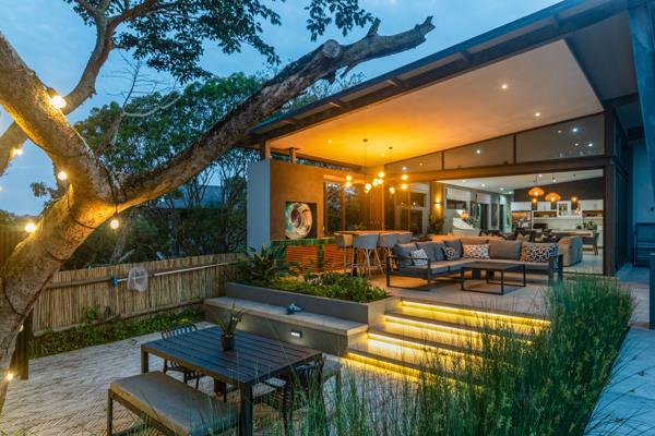 Three of the four spacious en suite bedrooms open directly onto the landscaped garden, offering tranquil green views and an easy connection to the outdoors. The main suite features a private juliette balcony overlooking the central pool area, creating a calm and elevated retreat. The entertainment space includes a built in braai area with a tiled worktop counter and integrated seating, making it perfect for gatherings that flow between indoors and outdoors. A double garage with direct access into the home and a third single garage or storeroom complete the picture. Staircase lighting, a firepit, and thoughtful built in seating areas add warmth and sophistication throughout. Beautifully lit at night and bright during the day, this residence truly embraces modern coastal living at every turn. The home is fully equipped with an upgraded solar and inverter system featuring 24 panels, ensuring energy efficiency and seamless living. It also includes a 12 000 litre Ube filtered water system, providing sustainability and convenience.