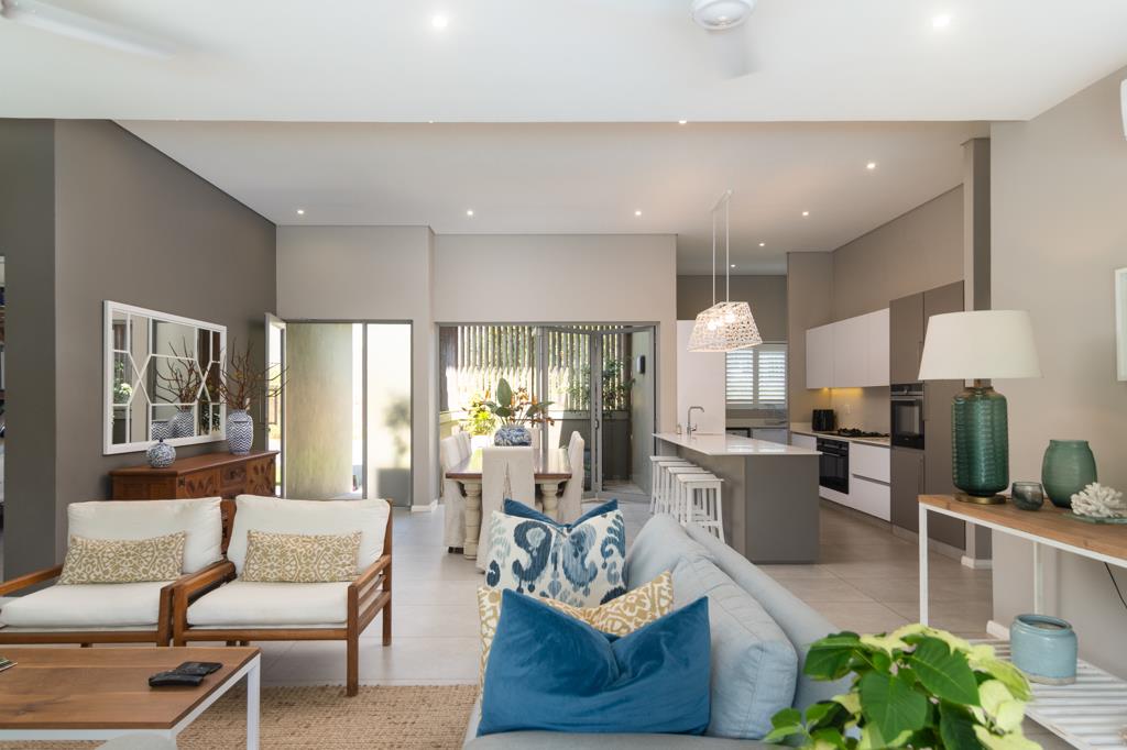 This stunning freestanding home is part of a sectional Scheme but still provides a fair amount of luxury, comfort, and space. It is the perfect opportunity for those who are looking for a ready-to-move-in home with no added work required. Upon entry, you are greeted by an expansive open-plan living area with soaring high-rise ceilings. The architectural design creates a sense of depth and space, making the entire room feel larger and more inviting. The seamless flow between the designated living spaces ensures effortless entertaining and ease of living.
