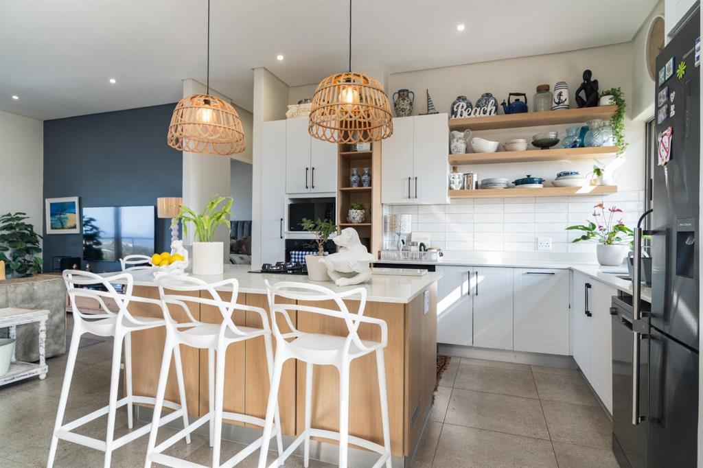 The elegant white kitchen has attractive Caesarstone countertops and a breakfast counter that merges with the adjoining dining room and lounge. Both the dining room and the lounge extend onto two separate outdoor deck areas, with the lounge connecting to the ocean facing verandah which holds ample space for both seating and alfresco eating. The crisp white, blue and grey palette used throughout the apartment imbues an overall calm and luxurious ambience.