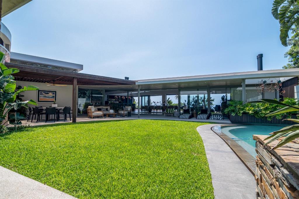 Entry is into a house-wide internal entertainers zone where swathes of glass and aluminum doors provide breathtaking views, interacting on both sides with the outdoors. One side adjoins a protected pool courtyard area with a seating area, an al fresco dining area, an outdoor cooking zone and an open-air shower. The other side of the entertainingliving areas opens onto a Balu deck that offers an idyllic platform to soak in the ocean vistas, plus a rim flow pool.