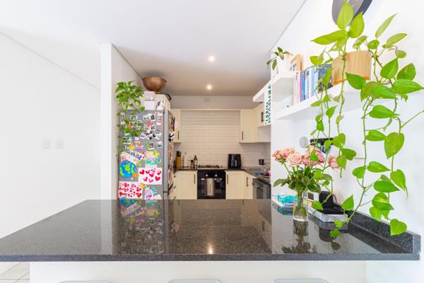 The stylish kitchen features sleek white cabinetry paired with bold black handles, flowing conveniently into a well-sized dining area. From here, the living area unfolds into a lounge with expansive glass sliding doors, bathing the interior in natural light and blurring the line between inside and out.