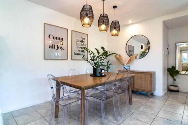 The chic kitchen area boasts elegant white cabinetry with black accent handles and practically adjoins the well sized dining room area. The dining room extends into the lounge which features large glass sliding doors that flood this entire area with abundant light, erasing the boundaries between indoors and outdoors.
