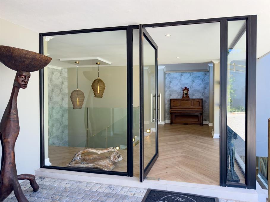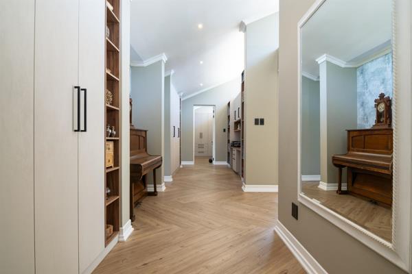 The glass enclosed entrance hall with large glass pivot front door leads into a light drenched entrance hall with a passageway inclusive of a built-in study area leading to four en suite bedrooms. A striking glass balustrade staircase leads down to the lower-level living area.