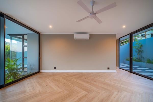 Modern with private and lush forest views. Elevated for uninterrupted treetop views, this contemporary 5-bedroom home blends luxury with relaxed indoor-outdoor living. Expansive glass walls flood the interiors with natural light, while open-plan spaces flow seamlessly onto a level garden with a rim-flow pool, sunken seating area, and putting green. All four upstairs bedrooms are en suite, air-conditioned, and open onto a full-length balcony with sweeping views. The master features a walk-in dressing room and luxurious open-plan bathroom. A fifth en suite bedroom is privately positioned downstairs.