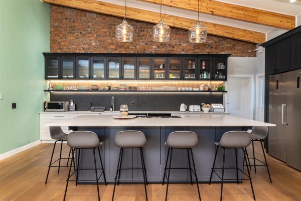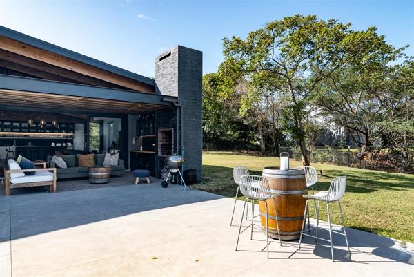 The sophisticated kitchen has a large central working island with ample storage/display cabinetry and an out of sight separate scullery. It also has access to an enclosed washing line courtyard. Expansive sliding glass doors lead out from the lounge onto a tastefully appointed roomy covered veranda with a stunning contemporary styled pergola roof. This tiled outdoor area has a built-in server and TV at one end and a built-in braai and bar area at the other end, and the tiles link onto the nearby pool as well as the main bedroom which has access onto this veranda area.