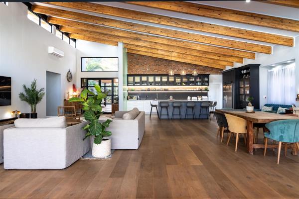 The soothing water feature at the front entrance sets the tone for the exceptional tranquil appeal of this stylishly updated single level residence. The high sloped roofscape with exposed wooden beams and the clerestorey windows are an arresting feature of the light filled spacious living area.