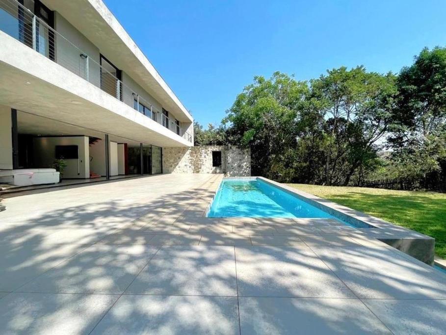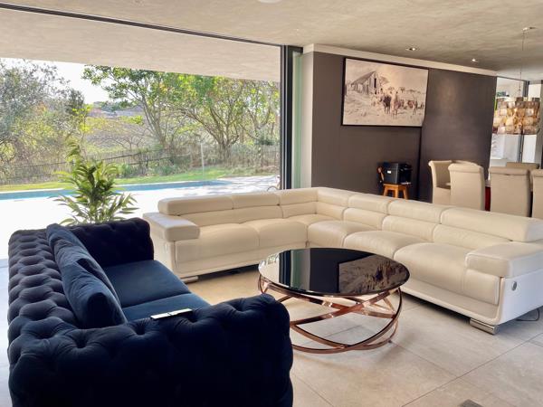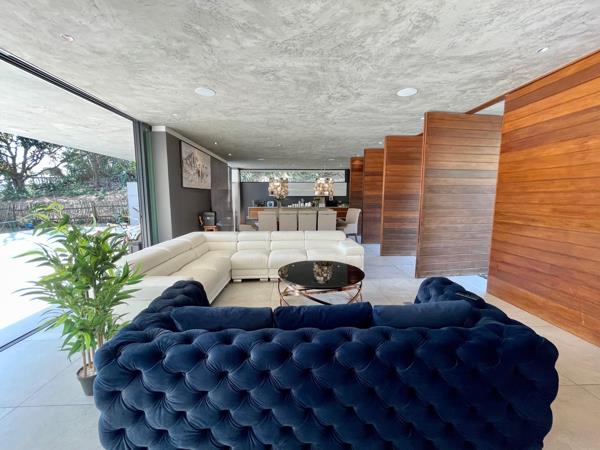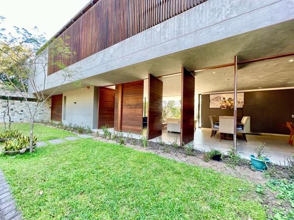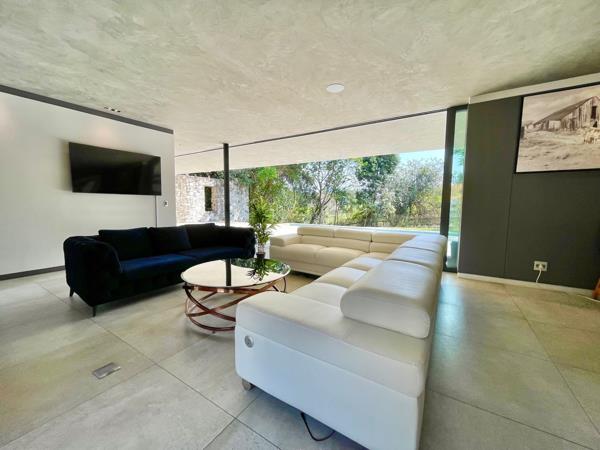 On the ground level, the expansive open-plan living areas serve as the heart of the home, overlooking the sparkling outdoor pool and a generously sized entertainment area. The interior is a harmonious blend of glass, steel, and wood, creating a striking aesthetic that exudes style and showcases exceptional craftsmanship. The kitchen is a culinary dream, featuring a tastefully integrated breakfast counter and a central island, while the discreetly positioned scullery ensures functionality without compromising the clean lines of the space.