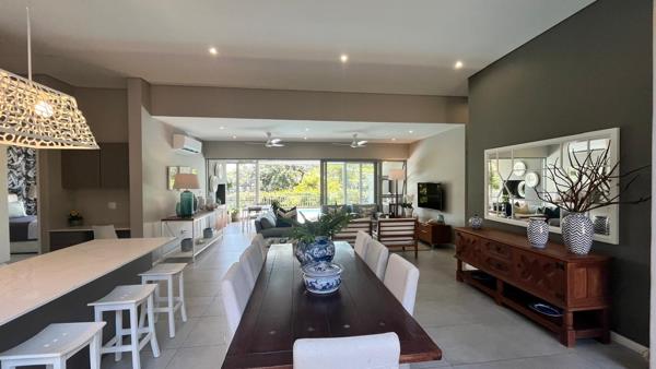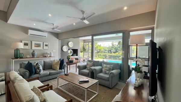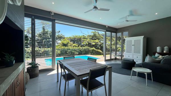 This stunning 4-bedroom home in Simbithi Eco Estate, is a masterclass in sophisticated living. The interior boasts a sleek, open-plan design that effortlessly combines living and entertainment spaces. Sliding doors open up to a sprawling deck and pool area, complete with lush gardens and distant ocean views - perfect for relaxing and entertaining.