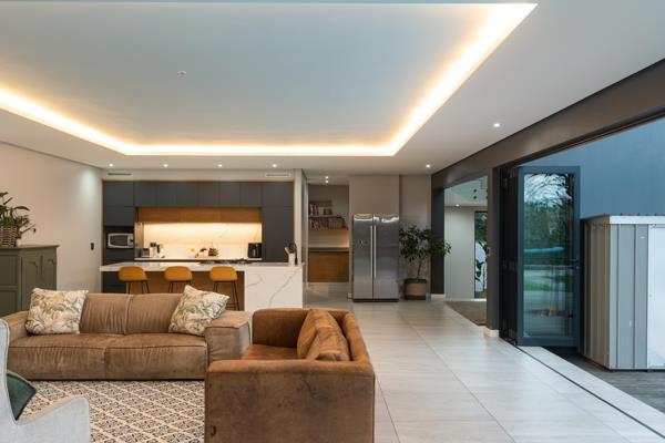 The home features four spacious en-suite bedrooms located on the upper level, along with a private study and a versatile second TV lounge or work-from-home space. The ground floor boasts elegant open-plan living and dining areas, enhanced by high-end finishes in current neutral contrasting tones. Designed for effortless flow, the indoor spaces connect seamlessly to a covered entertainment patio, sparkling pool, and a private garden set on a gentle elevation that offers tranquil views over the greenbelt, dam, and surrounding flora and fauna.
