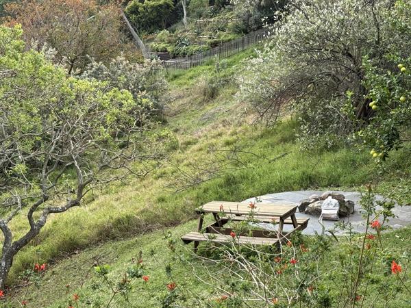 The chic white kitchen connects effortlessly to the lounge and dining areas, all of which extend onto a spacious covered patio. Perfect for entertaining, this outdoor space features a built-in braai and overlooks the landscaped garden complete with a firepit.