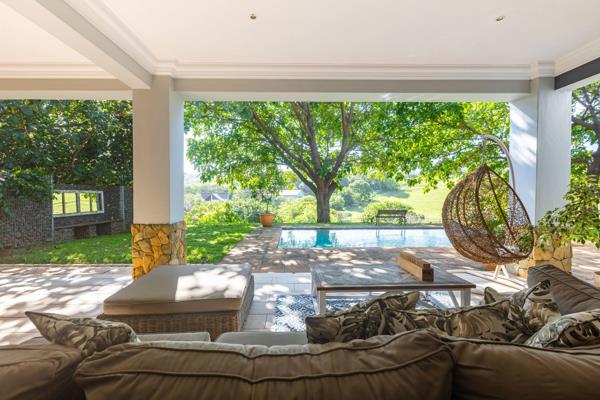 The open-plan upstairs living area and gourmet kitchen include a cozy nook and a champagne bar. With elevated views of the paddocks from indoors, the dining area opens up onto a undercover spacious patio to experience serenity with magnificent sunrises and sunsets. A scullery leads into the double garage, while downstairs, a second lounge and bar area connects to a sun-filled undercover patio overlooking the pool, garden and extensive Simbithi paddocks.