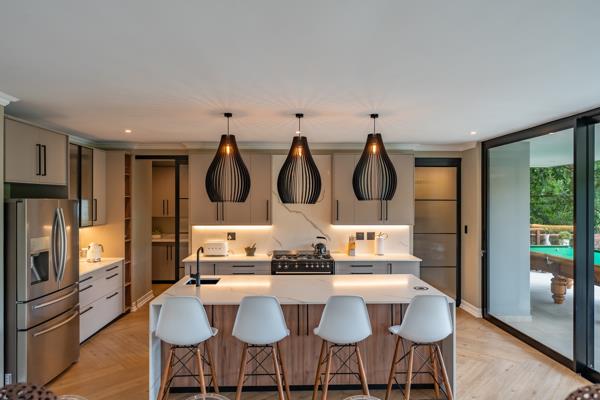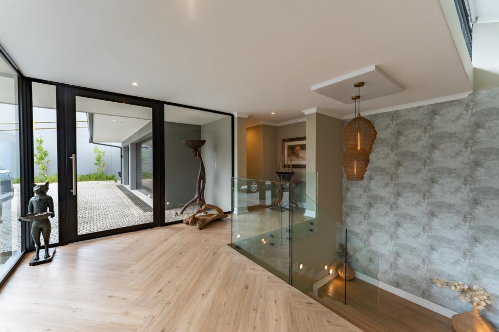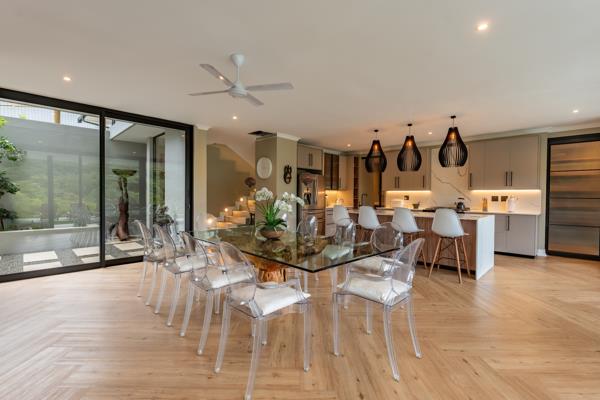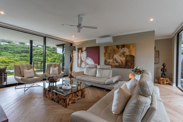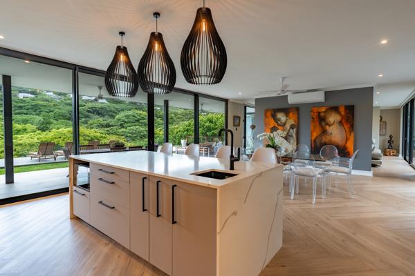 DUAL MANDATE | Contemporary home with high-end finishes located in Simbithi Eco Estate, offering privacy and elevated estate and forest views. The entrance features a double-volume staircase leading to the lower level, which includes the main living and entertainment areas. The kitchen is fitted with a large centre island with marble tops, modern finishes, and a separate scullery with a pantry. The living space opens onto a private courtyard and a covered patio with composite decking, a swimming pool, sunken seating area, and putt-putt green. This level also includes a guest bedroom and separate bathroom.